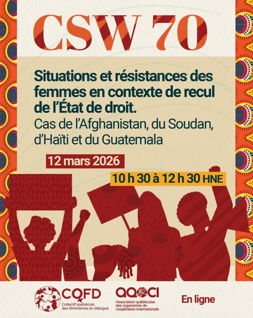 As part of the 70th session of the Commission on the Status of Women (#CSW70), the Collectif québécois des féminismes en dialogue (CQFD) is organizing a round table discussion bringing together four speakers involved in Afghanistan, Sudan, Haiti, and Guatemala.